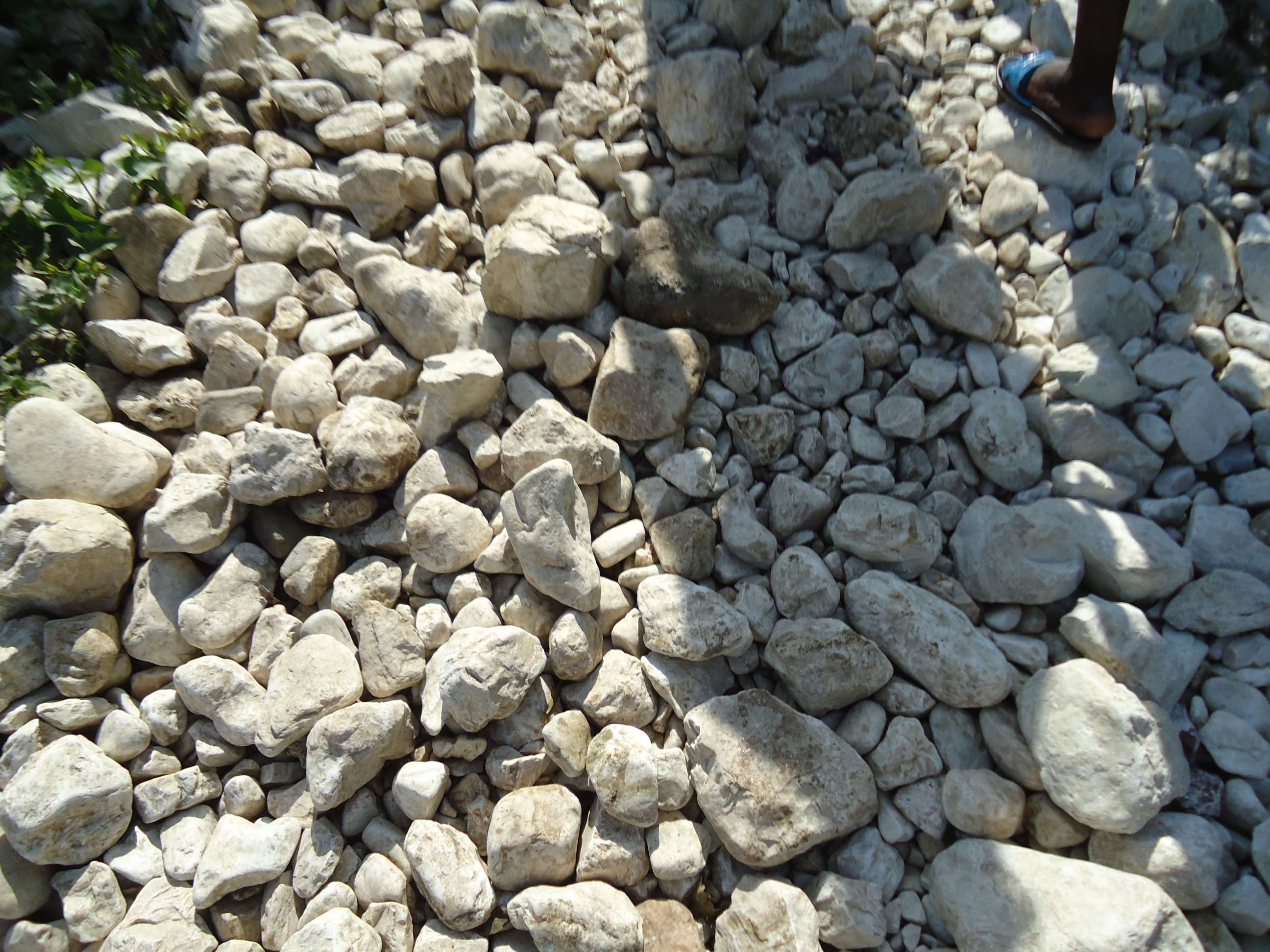 Rocks signify many things for Haitians. As means of income, smash rocks with a hammer to create gravel. Or mix crushed gravel with cement to build bricks. Rocks inhibit farmland, change the flow of water, and litter footpaths. Rocks show up in Haitian proverbs too: Woch nan dlo pa konnen doule woch nan soley. (“The rock in the water does not know the pain of the rock in the sun.”)