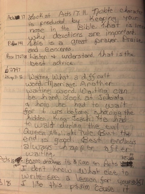 In addition, what I found so fascinating about the notebook is that it’s exactly what I do in these blogs. Read a passage, reflect on it, and then write about it. Writing, or journaling, helps to evaluate experience, and John Maxwell states that evaluated experience is more valuable than just experience. Writing also helps keep the lesson more ingrained and therefore more lived out than if I just heard or read it and did nothing about it (see James 1:23).